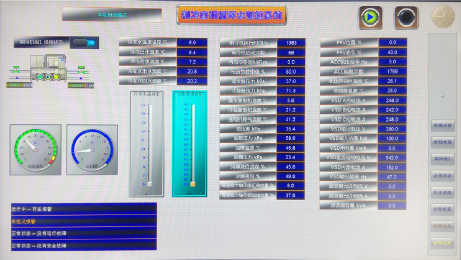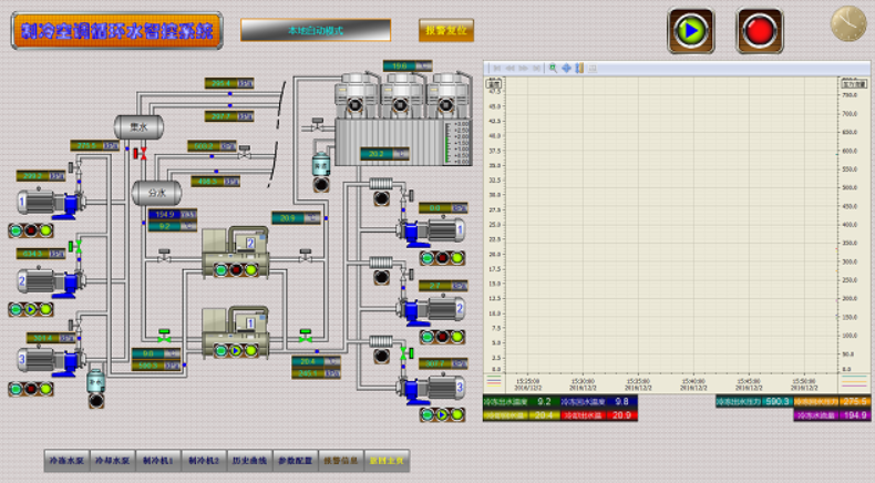 此項目采用西門子S7-300 PLC控制系統(tǒng)和分布式IO控制站、WinCC上位機監(jiān)控采集系統(tǒng),充分運用優(yōu)化的邏輯控制流程,并通過數(shù)字控制算法,調(diào)節(jié)各變頻泵、變頻冷水機組、電控調(diào)節(jié)閥,保證機組、水泵、冷卻塔投用及切換充分合理優(yōu)化,同時又能快速穩(wěn)定地響應(yīng)全部試驗間、生產(chǎn)車間在全范圍內(nèi)的負(fù)荷切換和波動,保持環(huán)境空調(diào)冷水、工藝試驗冷水、燃油冷水的工藝參數(shù)穩(wěn)定。在保證生產(chǎn)試驗要求的基礎(chǔ)上實現(xiàn)經(jīng)濟節(jié)能運行控制。